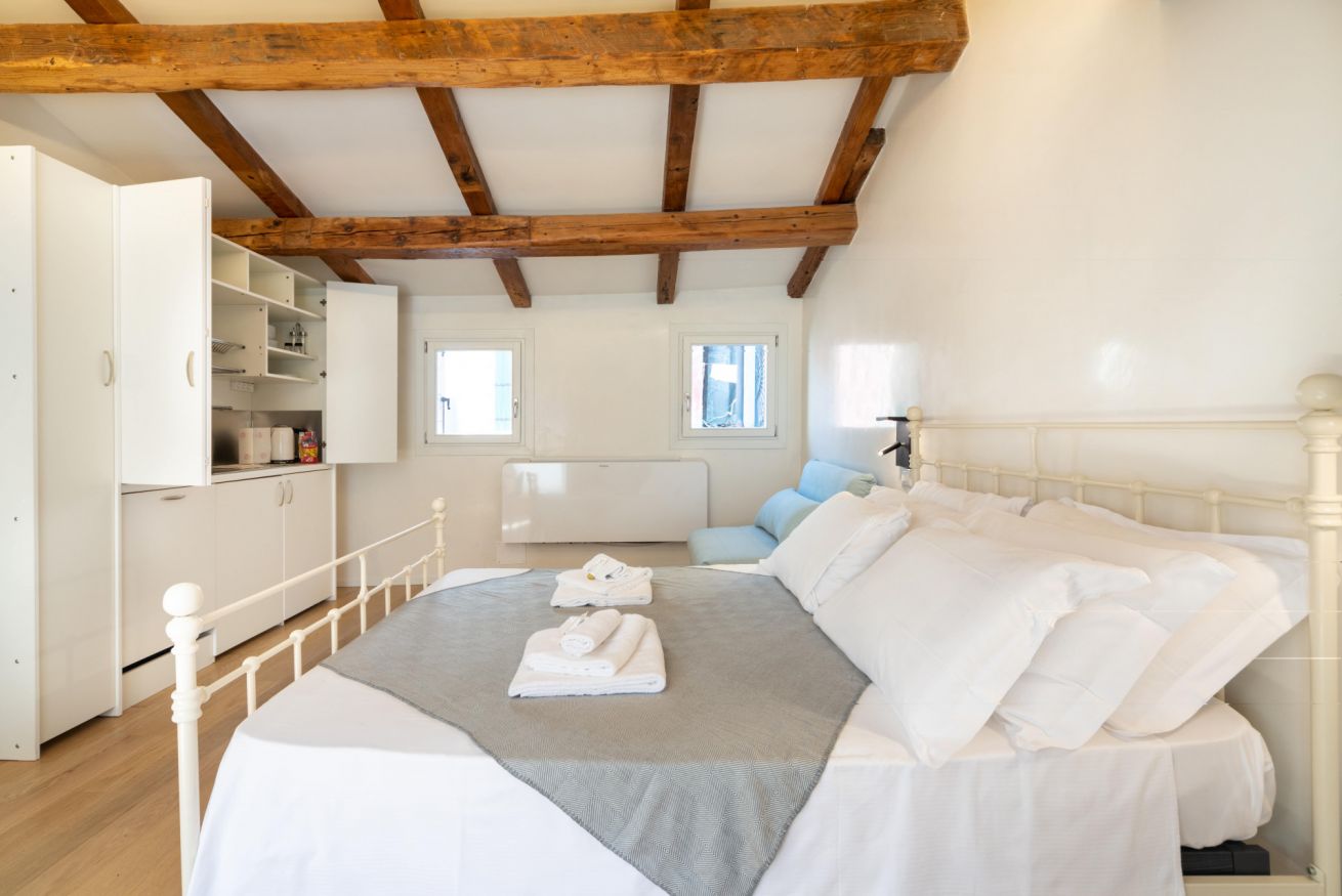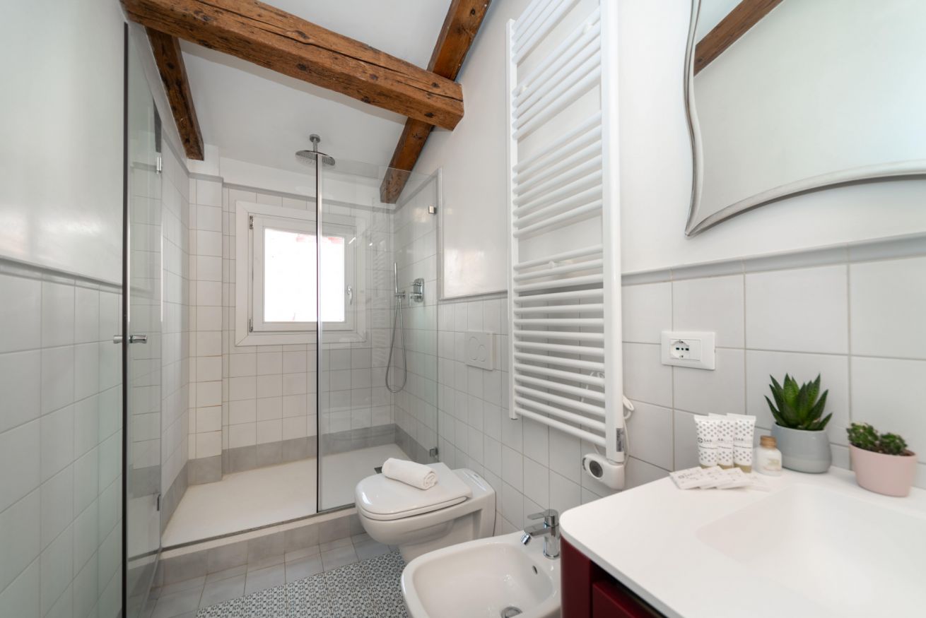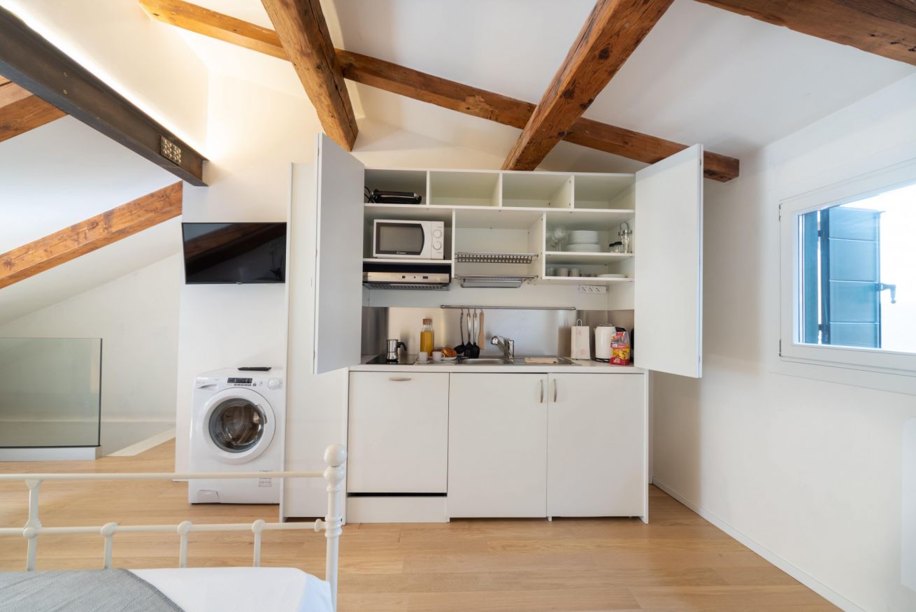 Palazzina Schiavoni – 3° piano è un appartamento luminoso e completamente ristrutturato situato nel sestiere di Castello, a pochi passi dalla Riva degli Schiavoni e da Piazza San Marco nel cuore di Venezia. Può ospitare fino a 3 persone ed è composto da una camera doppia, un divano letto singolo, una cucina ben attrezzata, un bagno moderno con doccia e una piccola terrazza con vista sulla città. L’appartamento offre Wi-Fi gratuito, aria condizionata, TV, frigorifero, lavastoviglie, moka, bollitore e lavatrice, garantendo comfort e funzionalità per un soggiorno piacente nella città lagunare. Si trova al terzo piano di un edificio storico senza ascensore.